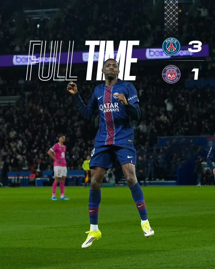 北京时间4月4日02:45,法甲联赛第28轮揭幕战,巴黎圣日耳曼主场对阵图卢兹。上半场,登贝莱凌空抽射破门。萨福诺夫扑球不远,尼古拉森扳平比分。KK7头球摆渡,登贝莱再下一城。下半场补时阶段,门德斯助攻,贡萨洛-拉莫斯建功。全场比赛结束,巴黎3-1击败图卢兹。