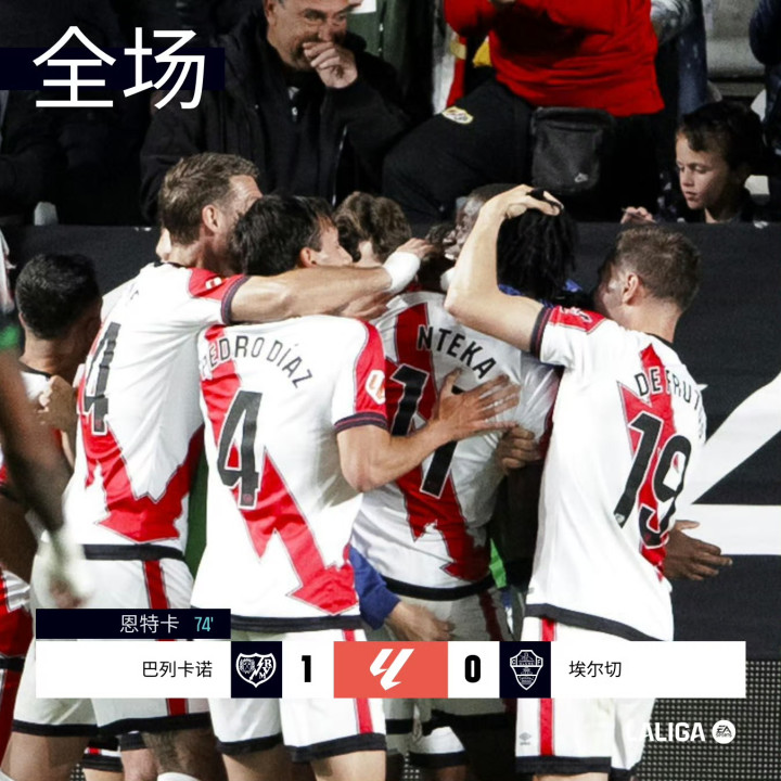 巴列卡诺1-0十人埃尔切,恩特卡制胜